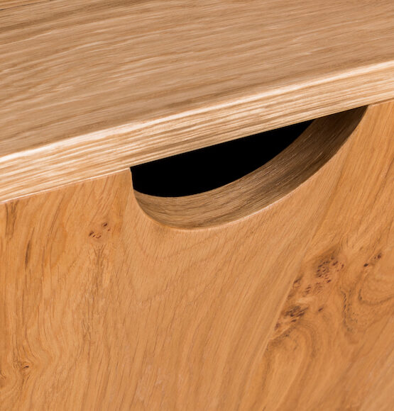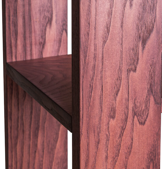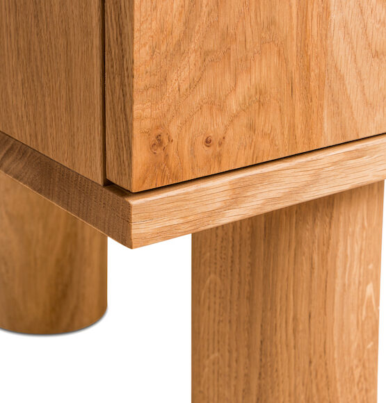 Blat, podstawa oraz toczone nogi wykonane z litej dębiny. Boki oraz tył ze sklejki fornirowanej dębiną. Nadstawka (półki i pionowe elementy) wykonane ze sklejki fornirowanej jesionem bejcowanym na kolor BORDO. Na drzwiczkach ręcznie układana intarsja, czyli geometryczny wzór z forniru (cienkich płatów naturalnego drewna) – w tym wypadku pasy z dębiny oraz czeczoty dębowej. Ponadto drzwiczki wyposażone w zawiasy z hamulcem.