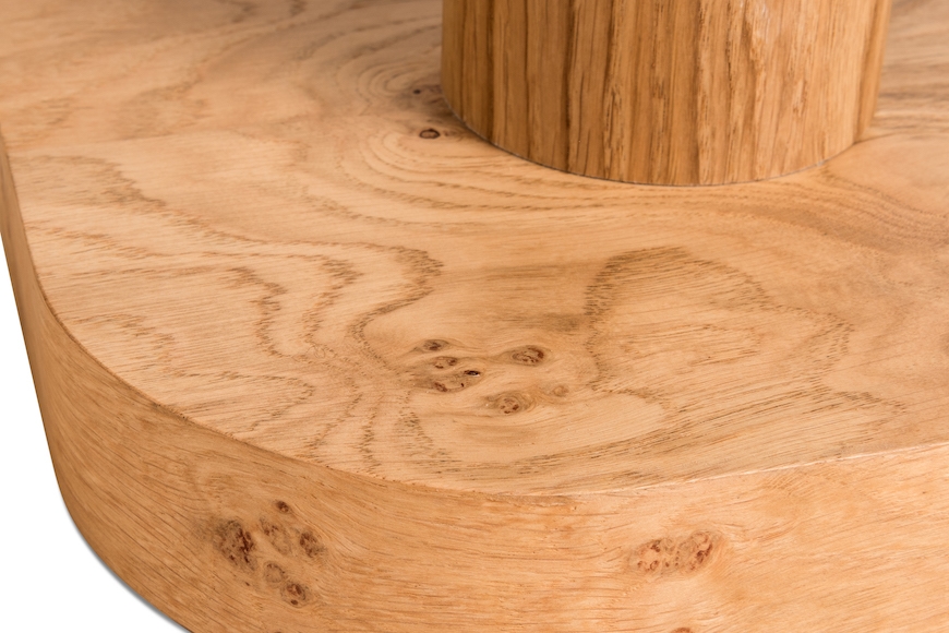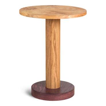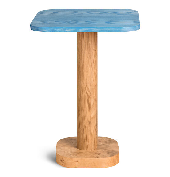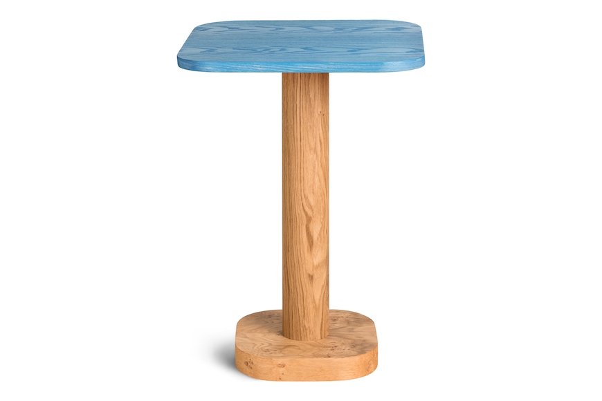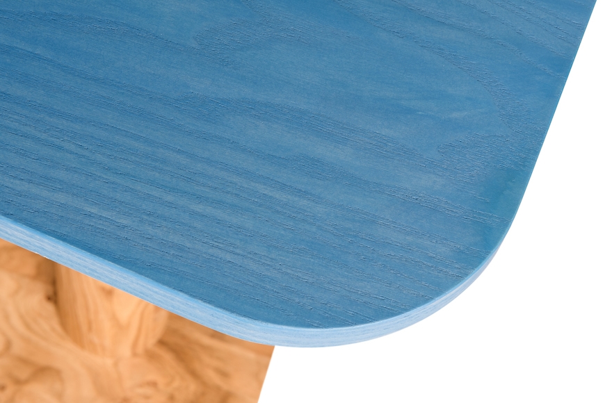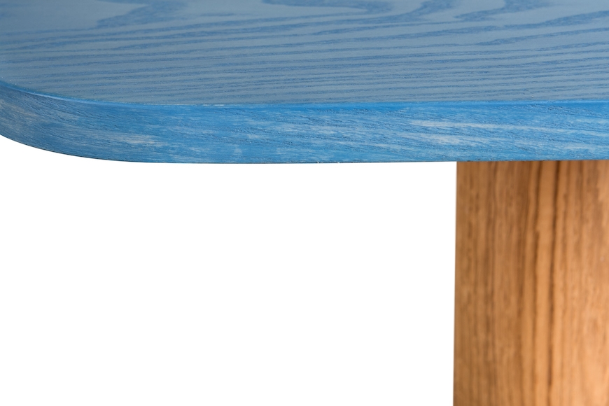 Blat oraz obrzeże z litej sklejki liściastej fornirowanej jesionem bejcowanym na kolor BŁĘKIT. Ponadto noga toczona z litego drewna dębowego. Podstawa stolika wykonana ze sklejki fornirowanej czeczotą dębową. Dodatkowo całość pokryto twardym lakierem odpornym na alkohol i temperaturę.
