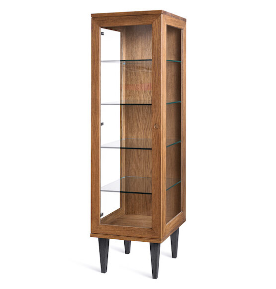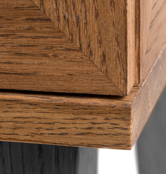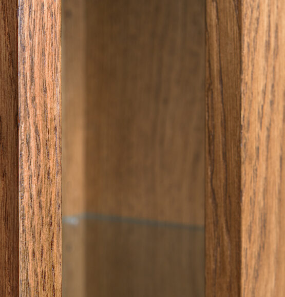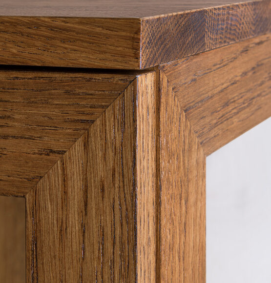 Blat, podstawa, drzwiczki, boki oraz tył wykonane ze sklejki liściastej fornirowanej dębiną. Dodatkowo drzwiczki i boki witryny są przeszklone. Całość barwiona na ciepły głęboki kolor koniak, nogi z litego drewna dębowego lakierowane na czarno. Na koniec drzwiczki z funkcją cichego domknięcia.